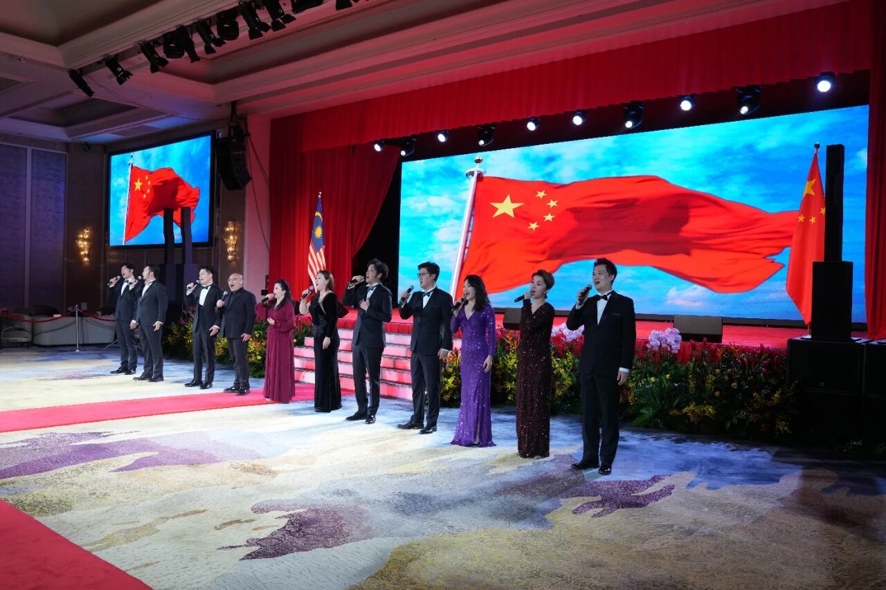 时隔一日,9月29日19:00,吉隆坡香格里拉酒店内华灯璀璨,中国驻马来西亚大使馆举行庆祝中华人民共和国成立76周年招待会。中国驻马来西亚大使欧阳玉靖,马来西亚交通部长陆兆福,旅游、艺术及文化部长张庆信,通讯部副部长张念群,中央歌剧院党委书记张旭霞与各界友人、驻马使节、华侨华人、在马中资企业和中国留学生代表等1000余人出席。